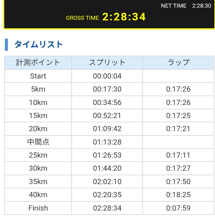 4週間前のレガシーハーフや2週間前のⅯペース付近でのハーフ走など状態が良いっていうわけではなかった。ただ、大会当日走ってみると、うまく疲労が抜けてくれたようで、5kmごとのラップは30km過ぎまで「17分25秒」で推移した。