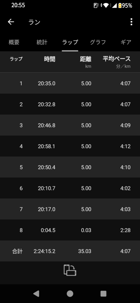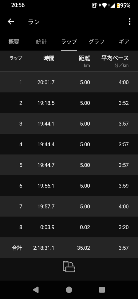 30kmではなく、35km走を行った理由は2時間でトレーニングを終えてしまうのとペースをkm/10秒ほど遅くなってもいいからレースタイムに近づく練習をしたほうが効果があると思っているからです。